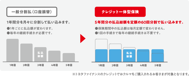 トヨタファイナンス(株)のクレジットでおクルマをご購入されるお客さまが対象となります。 ※ご購入に際してはトヨタファイナンス(株)の与信承認が必要となります。 ※ご契約いただくクレジットによってはクレジット一体型保険を引き受けできない場合がありますので、詳しくは販売会社営業スタッフまでお問い合わせください。 |