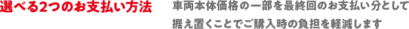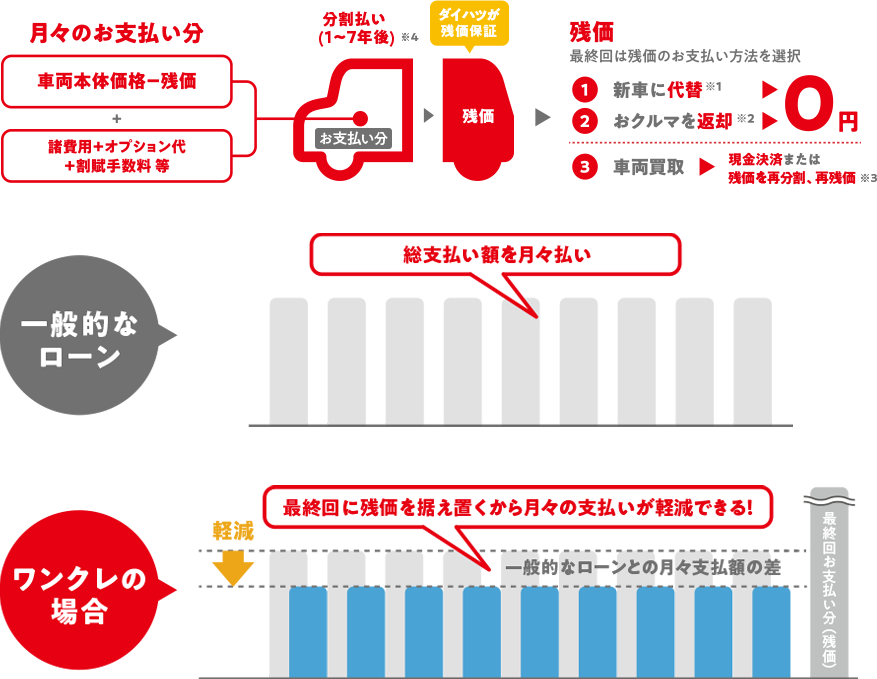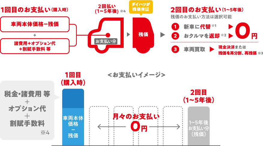 ●設定残価は、車両状態が規定内である場合のみ保証いたします。●ご購入いただいた販売会社に車両をご返却の上、新車にお乗り換えの場合(※1)、およびご購入いただいた販売会社にご返却の場合(※2)、残価分のお支払いは不要ですが、車両状態が事前に定められた規定外である場合には、別途精算金をいただきます。●最終回でお買い上げ(現金決済・再分割・再残価)をご選択された場合、最終回のお支払額(残価)を含めたお支払合計額は、一般的なローンの方が軽くなる場合があります。●お買い上げの際に再分割、再残価も選択できます。(※3)●お支払い期間については、販売会社により設定が異なります。(※4)詳しくは販売会社スタッフにお問い合わせください。